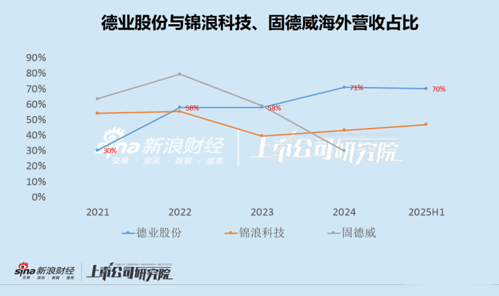值得注意的是,德业股份海外营收占公司总收入的比例,从2021年的30%大幅提升至2024年的70%,近两年占比明显超过锦浪科技和固德威。