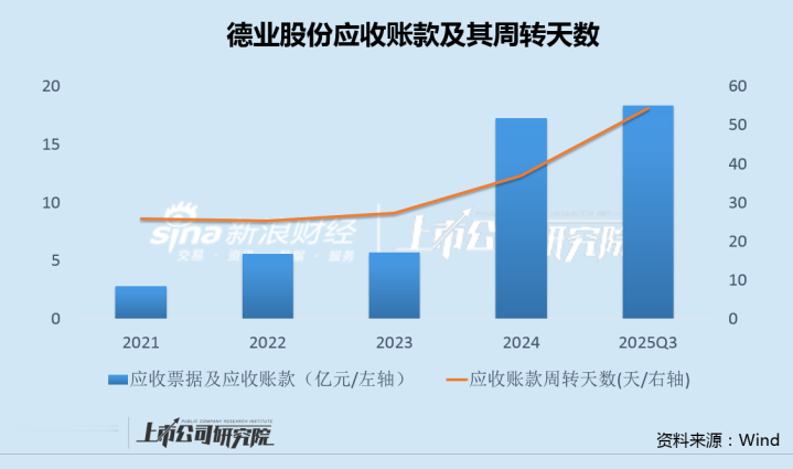 Wind数据显示,德业股份应收账款和应收票据从2021年的2.76亿大幅攀升至2024年的17.29亿,其中2024年一年内,增幅就超过200%;同时,公司应收账款周转天数也持续走高,回款不断恶化。